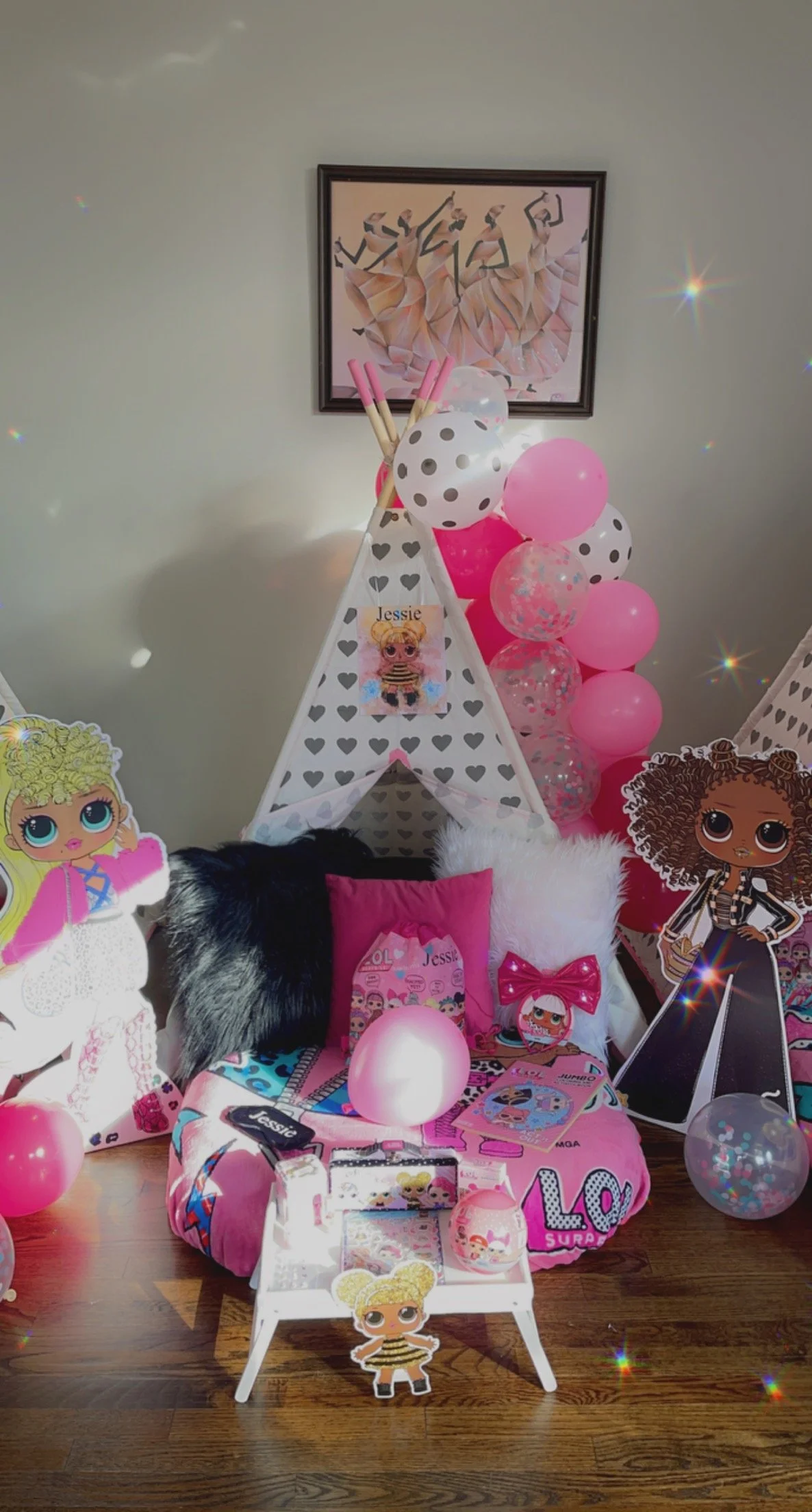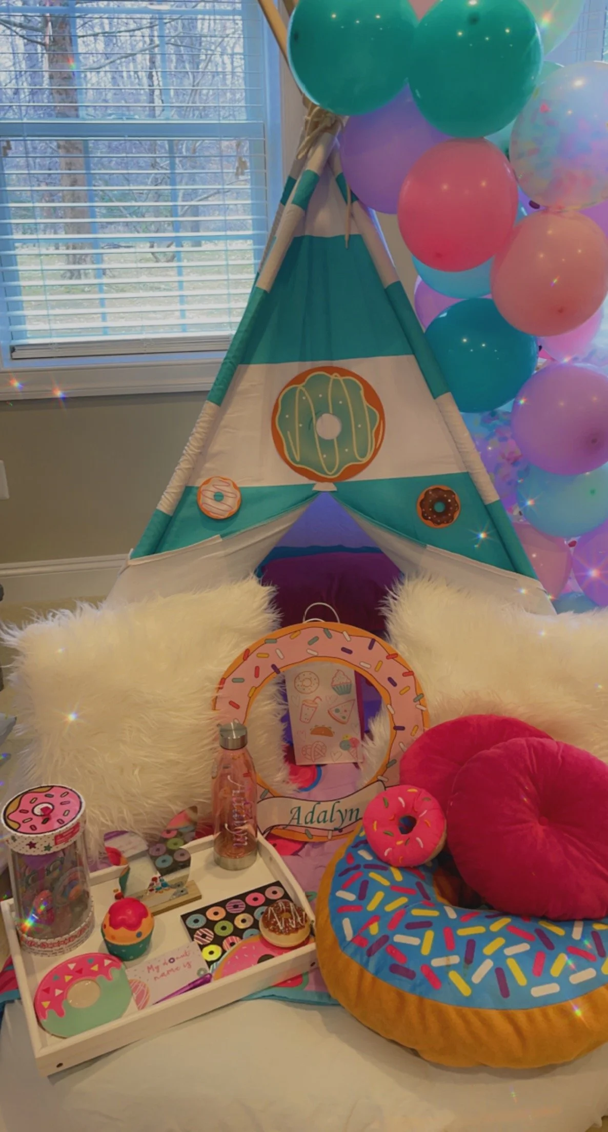 This sleep suite will NOT include a theme, ONLY a color scheme. Lap trays will be set up empty. Ideally this set up is for a host that loves the idea and would like to create “Magic” on their own! This setup is for up to 5 guest including the guest of honor. Additional guest may be added up to 7 guest tee pees max. Added guest suites start at $85 +tax